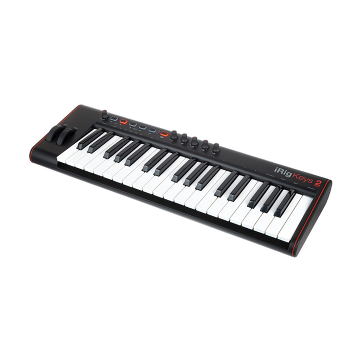 iRig Keys 2 PRO de IK MULTIMEDIA. Teclado controlador MIDI con 37 mini-teclas sensibles a la velocidad, Ruedas de pitch bend y modulación, Botones retroiluminados El botón SET para almacenar y cargar 4 configuraciones diferentes personalizadas, Entrada para un pedal opcional de sostenimiento o expresión. Compatible con Core MIDI (iOS) y USB (Mac/PC) – plug and play. Funciona con dispositivos Android a través del cable cable de OTG a Micro-USB incluido. Adicional tiene salida de audio por medio de audifonos y entradas y salidads MIDI.