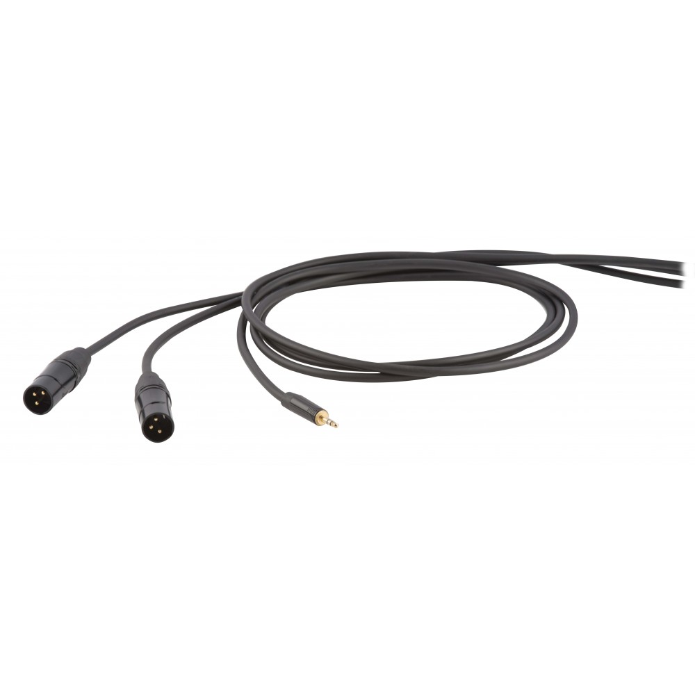 Cable profesional Die Hard con conector estéreo de 3.5 mm a 2 XLR macho. 5 m de longitud. Color negro.