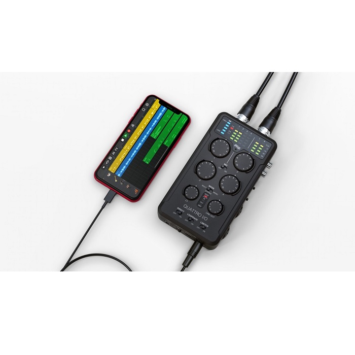 iRig Pro Quattro I/O es una interfaz de audio y MIDI portátil de 4 entradas / 2 salidas de nivel profesional con todo lo que necesitas para grabación de campo impecable, creación de contenido, transmisión, podcasting y presentaciones. Para iPhone, iPad, Android, Mac/PC. Funcionamiento a 24-bit, 96 kHz. Limitador incorporado y modo de seguridad de -12 dB. Alimentación USB, 9VDC o baterías.