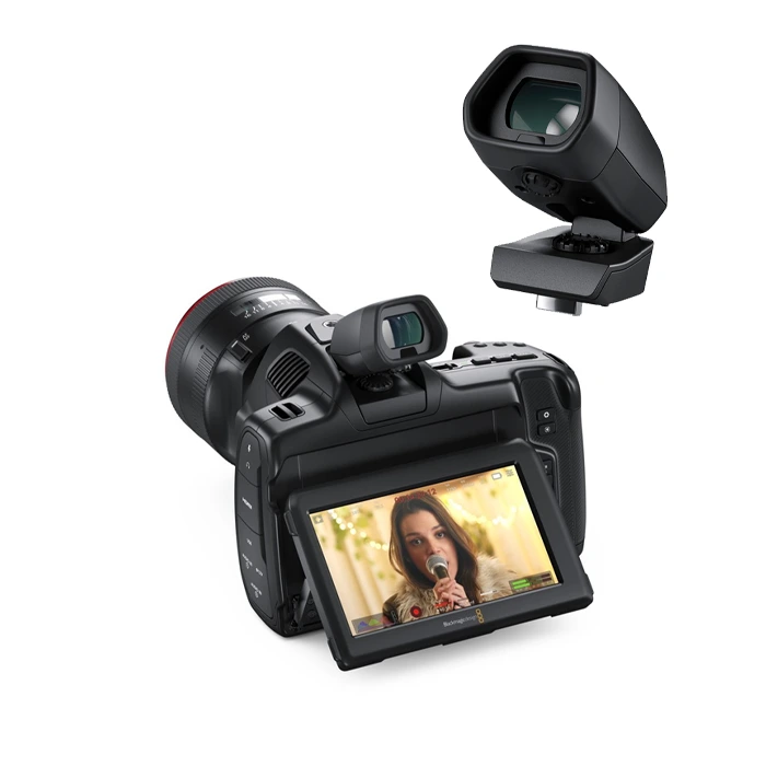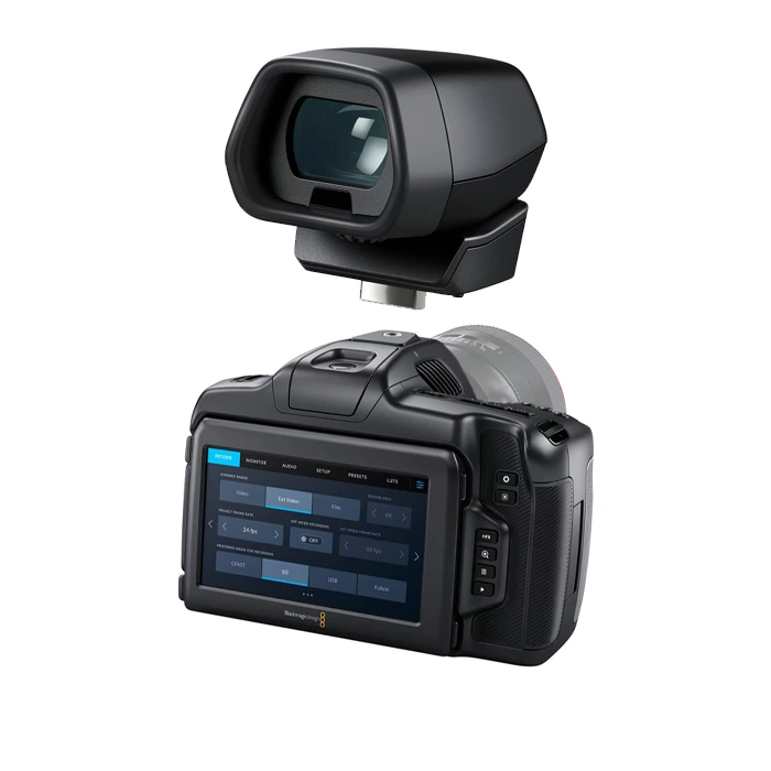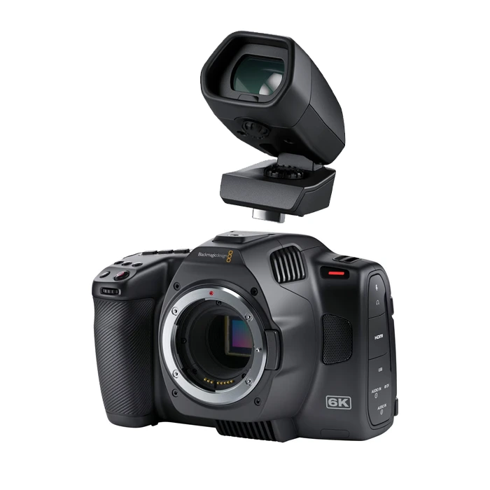 El modelo Blackmagic Pocket Cinema Camera 6K G2 incluye un sensor Super 35 con una resolución de 6144 x 3456 y una montura EF que facilita el uso de objetivos fotográficos de mayor tamaño, a fin de captar imágenes de calidad cinematográfica con una menor profundidad de campo. Además, dispone de una pantalla LCD de inclinación ajustable, una montura para visores, entradas de audio mini-XLR y una batería tipo NP-F570+ Visor de gran calidad con sensor de proximidad, dioptría de vidrio de 4 elementos, información integrada y carta de enfoque digital.