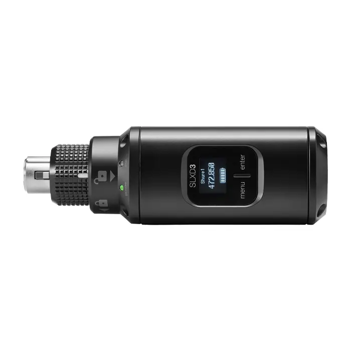 Transmisor Inalámbrico Digital Plug-On SLXD3 convierte cualquier fuente XLR, incluso los micrófonos dinámicos y de condensador, para usarlos como transmisores inalámbricos SLX-D. Con un anillo de traba patentado para lograr una conexión segura y sin contratiempos, el SLXD3 envía audio digital de 24 bits desde cualquier fuente XLR a receptores Digitales Inalámbricos SLXD4 y SLXD5 a través de una sólida conexión RF. Utilice IR Sync para sincronizar transmisores fácil y rápidamente con el receptor inalámbrico SLX-D de su elección. Una brillante pantalla frontal OLED muestra estados clave del sistema, incluso la carga de la batería y la frecuencia de transmisión.